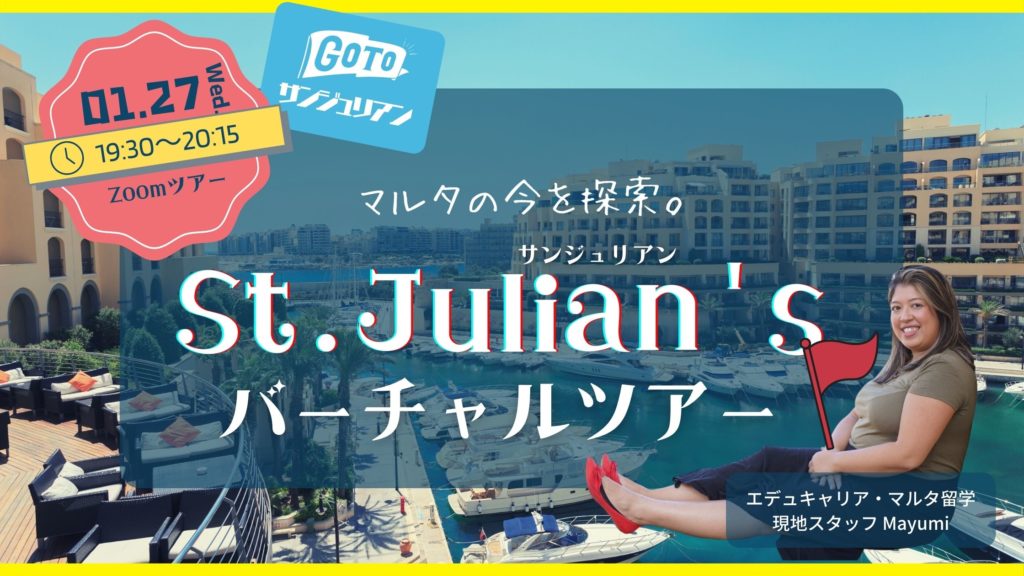 ”コロナ禍でも渡航できる留学先” “ヨーロッパの中でもリーズナブルに留学できる国”として注目されているマルタの魅力や現在のリアルな状況を生配信でお届けする「マルタバーチャルツアー」を7月3(土)、7(水)、11(日)、17(土)、21(水) の全5回で実施いたします。参加費は無料で、1回のみの参加も可能です。